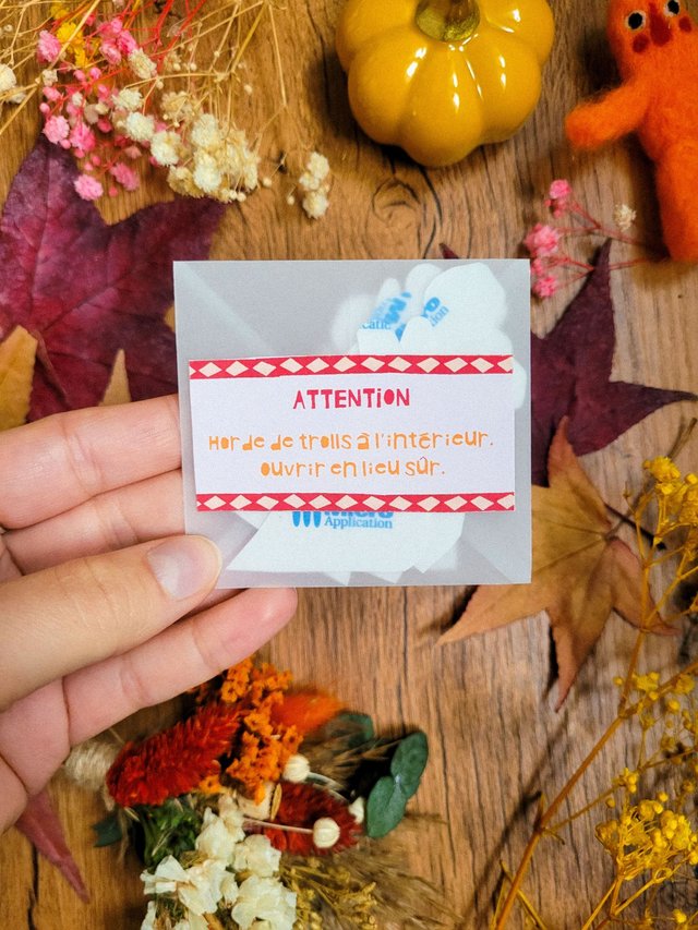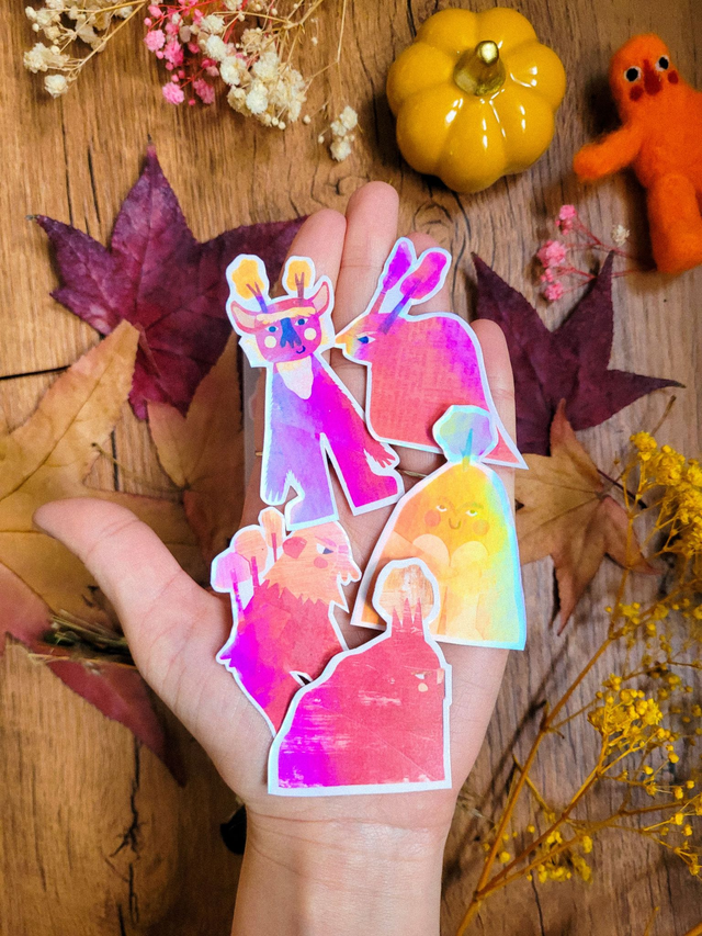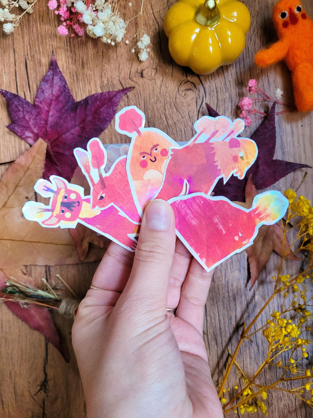 ✸ Cette mini enveloppe contient une joyeuse horde de 5 de 5,5 x 3 cm environ. Ils sont fabriqués et découpés à la main puis recouverts de papier holographique qui les protège et leur donne des reflets arc-en-ciel au soleil.